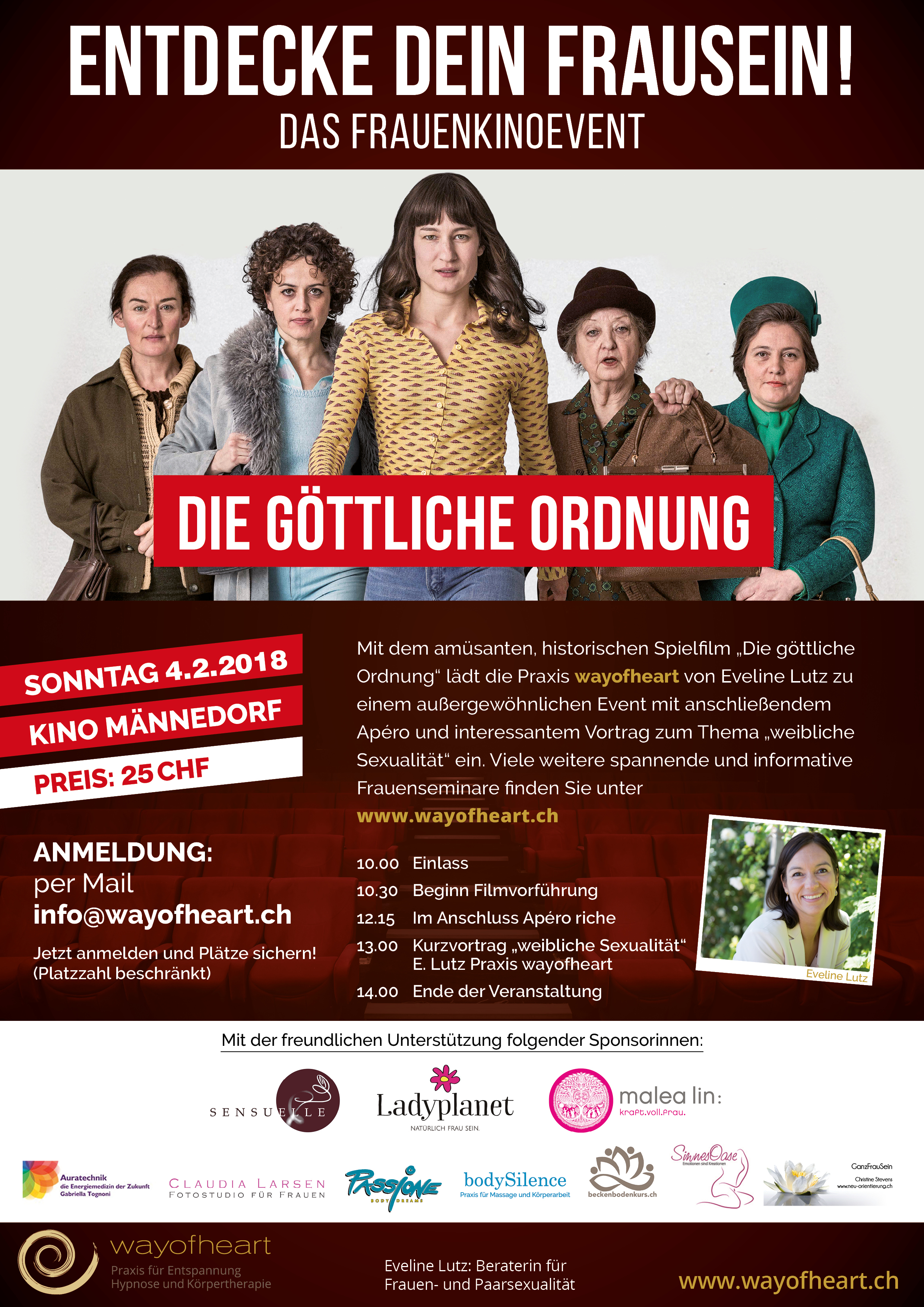 Am Sonntag, 4. Februar 2018 um 10.30 Uhr findet im Kino Männedorf ein Frauenevent der besonderen Art statt. Ich freue mich als Sponsorin dabei zu sein. Neben dem sehenswerten Schweizer Spielfilm rund ums Frauenstimmrecht, erwartet Sie ein Kurzvortrag von Eveline Lutz über weibliche Sexualität und weitere Ueberraschungen...